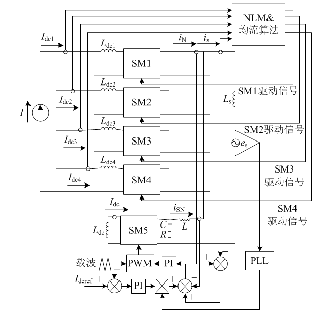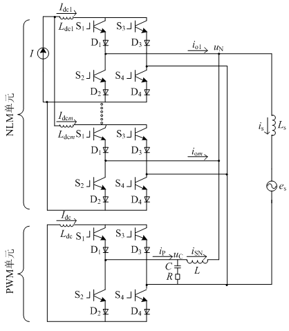 圖1中:I為變流器NLM單元直流側電流源電流;IdcmIdcm(m為正整數)為NLM單元子模塊直流側電流;iomiom為NLM單元子模塊輸出電流;IdcIdc為PWM單元直流側電流;iPiP為PWM單元交流側輸出電流;iSNiSN為PWM單元輸出補償電流;iSiS為網側電流;eSeS為電網電壓;uNuN為交流側公共連接點電壓;uCuC為PWM單元交流側電容電壓;LdcmLdcm為NLM單元直流
