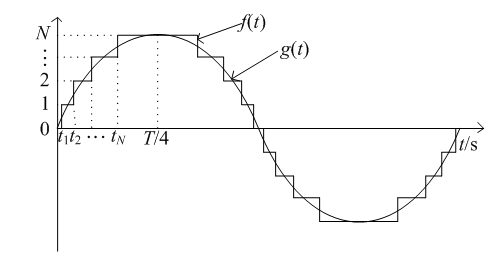 設調制波g(t)=Nsin(ωt)g(t)=Nsin⁡(ωt),則階梯波f(t)f(t)為