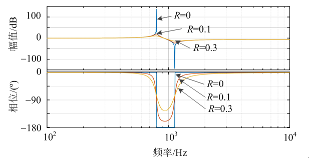 根據表3參數繪制的W2(s)W2(s)的Bode圖(圖5),可見即使PWM單元是理想的受控電流源,iSiS依然會在ωn=1/(L+LS)C−−−−−−−−−−−√ωn=1/(L+LS)C處產生并聯(lián)諧振,通過在PWM單元的電容支路串聯(lián)阻尼能有效地起到抑制諧振峰的作用[17],阻尼比ξ=(R/2)C/(L+LS)−−−−−−−−−−√ξ=(R/2)C/(L+LS)。
