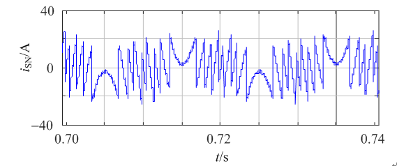 對稱性,取1/4周期分析,其余3/4周期類似??梢钥闯霎擭LM單元投入0個子模塊時,4個子模塊都旁路,各子模塊維持原電流值;投入1個子模塊時,投入的那1個子模塊電感電流減少,其余