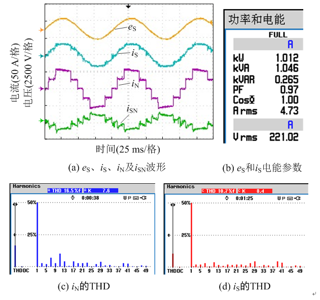 圖15(a)從上至下依次為系統(tǒng)網側電壓eS、NLM單元和PWM單元輸出電流疊加后的網側電流iS、NLM單元輸出電流iN和PWM單元輸出的補償波形iSN。圖15(b)為網側電能參數,功率因數為0.97,基本實現(xiàn)了單位功率因數。圖15(c)為iN的THD,由于實驗只采用2個H橋級聯(lián)的NLM單元,其THD較大,達到了16.5%。圖15(d)為iS的THD圖,經過PWM單元的諧波補償作用,不僅使iS實現(xiàn)了正弦化,而且THD降為10.7%,效果顯著。